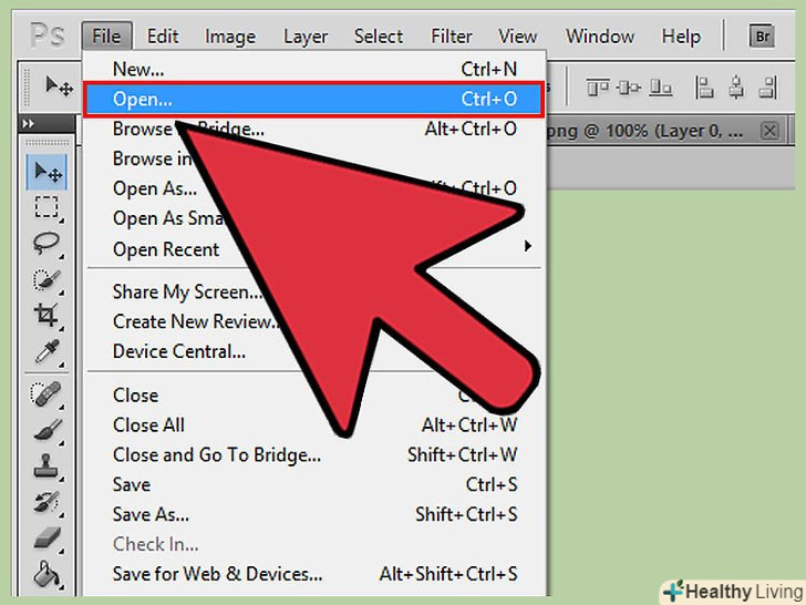 Запустіть Photoshop зі стартового меню програм своєї операційної системи.у відкритому інтерфейсі програми Виберіть в основному меню пункт»Файл". З розгорнутого списку підменю виберіть команду»Відкрити". Через вікно програми знайдіть і відкрийте необхідне зображення.