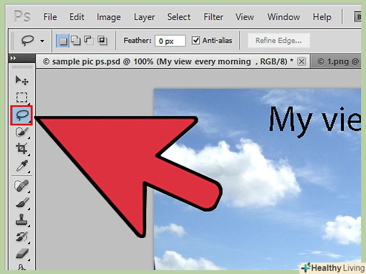 У правій частині інтерфейсу на панелі інструментів виберіть ярлик "шари". всередині вікна панелі інструментів клікніть правою кнопкою миші по потрібному шару і виберіть з контекстного меню пункт «Растрировать». Виберіть інструмент "ласо" в опціях панелі інструментів. Потім виділіть ту частину зображення, яку хочете видалити. Натисніть кнопку "Delete". В меню програми натисніть пункт "Файл «і виберіть» Зберегти", щоб зберегти зроблені зміни.[4]- З усіх інструментів Photoshop інструмент "ласо", ймовірно, є найбільш простим для розуміння принципів роботи з ним. Коли обраний даний інструмент, курсор миші перетворюється в мініатюрне зображення ласо, а вам необхідно клікнути їм збоку від тексту, який потрібно видалити. Продовжуйте утримувати кнопку миші натиснутою і обведіть курсором навколо тексту. Коли все буде готово, натисніть кнопку "Delete" для видалення тексту.[5]