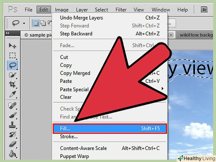 Виберіть інструмент "ласо" на панелі інструментів у лівій частині екрана.клікніть мишкою поруч з текстом. Обведіть ласо навколо тексту. Обов'язково залиште невеликий відступ від тексту при обводці. Це дозволить Photoshop краще змішати тони кольорів для заливки ділянки з віддаленим текстом.[7]