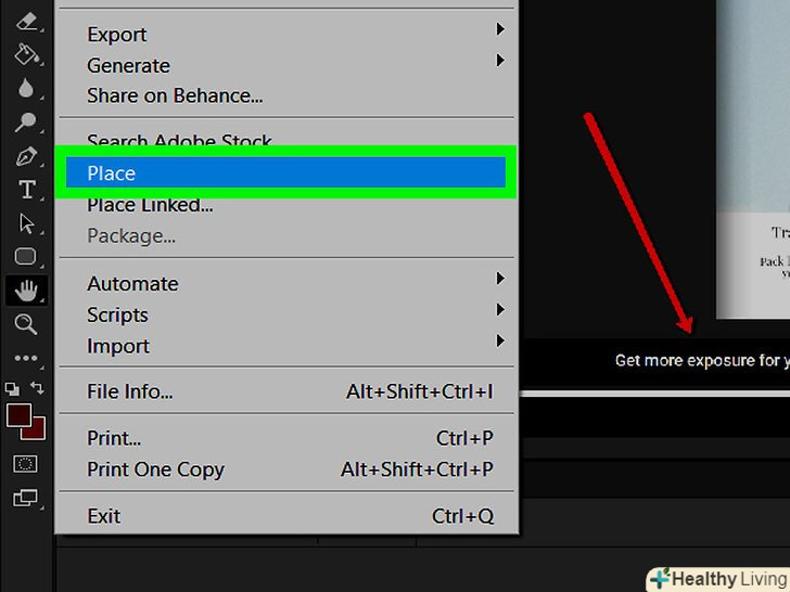 Виберіть опціюПомістити... недалеко від центру меню, щоб відкрити диспетчер файлів.- У деяких версіях Photoshop ця опція називається»помістити вбудовані".