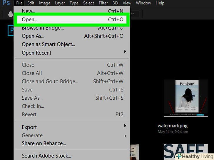 Відкрийте файл із зображенням, яке хочете імпортувати.знову відкрийте меню "Файл«, виберіть» Відкрити" і двічі клацніть по другому файлу.- Тепер кожне відкрите зображення знаходиться на окремій вкладці у верхній частині Photoshop.