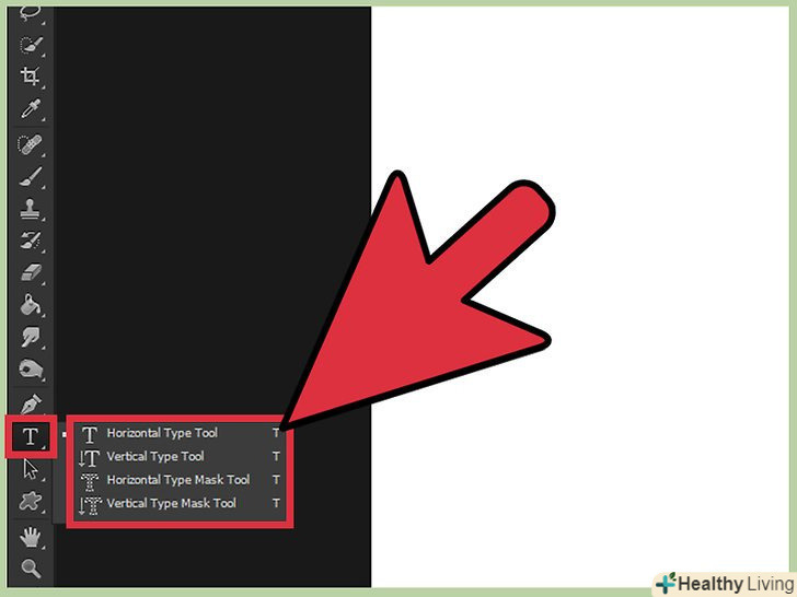 Натисніть і утримуйте іконку "Текст" на панелі інструментів, щоб вибрати інші варіанти введення тексту. ця іконка виглядає як буква "T". Натисніть і утримуйте "T", щоб побачити такі можливості:- Горизонтальний текст: використовується найчастіше і дозволяє друкувати букви по горизонталі зліва направо. Цей параметр використовується при звичайному виборі інструменту "Текст".
