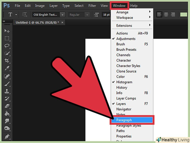 Встановіть параметри тексту за допомогою меню у верхній частині екрана.після виклику інструменту "Текст" у верхній частині вікна Photoshop з'явиться панель з вибором кольору, шрифту, вирівнювання і розміру тексту. Також можна використовувати пункти "Символ"і " Абзац". Вони нагадують пункти в програмах на зразок Microsoft Word. Для виклику відповідних пунктів знайдіть вкладку " вікно "у верхній частині екрана і виберіть" Символ "і"Абзац".[1]- Шрифт: дозволяє вибрати різні варіанти шрифту на зразок Arial або Times New Roman.