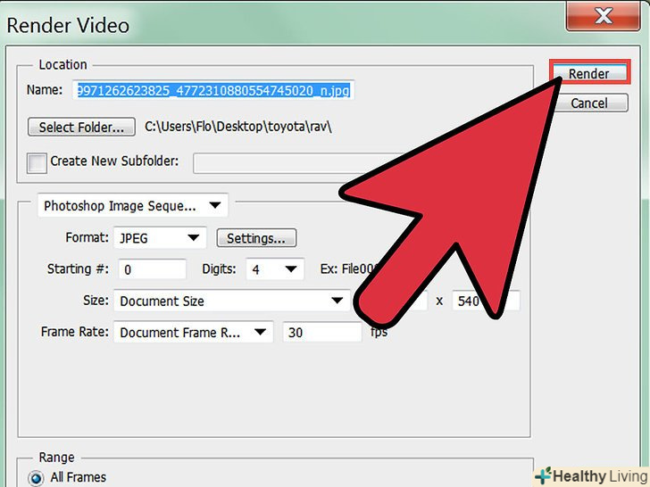 Після появи першого зображення, перейдіть до пункту меню File(Файл) - Export(експортувати).у діалоговому вікні виберіть місце, куди зберегти файл. У властивостях файлу послідовно виберіть QuickTime Movie( Формат QuickTime), Settings(Налаштування), Compression Type H. 264(Тип стиснення H. 264), OK. Size, 1280 X 720 HD, check Preserve Ratio box, in the drop down select Letterbox, OK. Render.