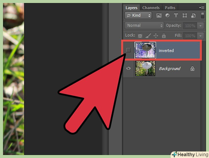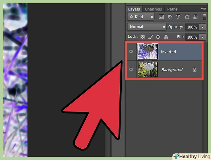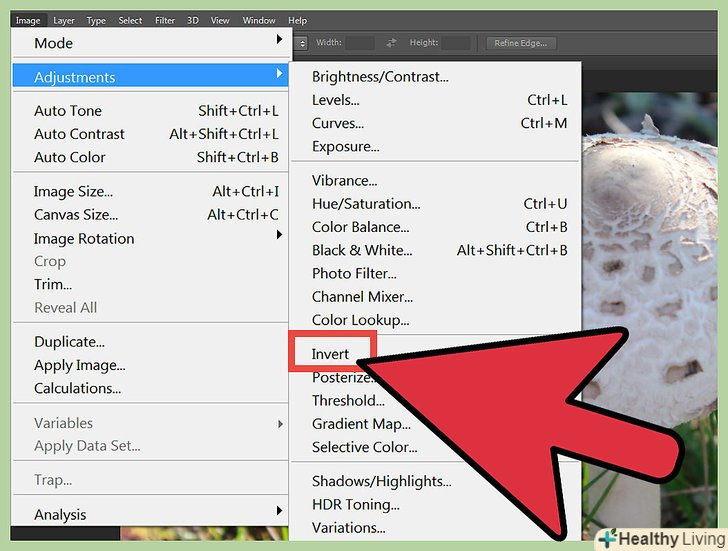 Інвертуйте зображення.клікніть по полю "Create New Fill or Adjustment Layer" в нижній частині панелі Layers; знайти цю кнопку можна, якщо навести мишку на список опцій. Далі виберіть зі списку пункт "Invert". Програма додасть шар з назвою "Invert Adjustment" відразу ж після цього, причому цей шар буде знаходитися поверх того шару, що був активним на момент проведення інвертування.[3]- Якщо перед проведенням інвертування ви вибрали якусь область, то Photoshop створить маску шару для інвертованого шару і змінить кольори в позначеній області.