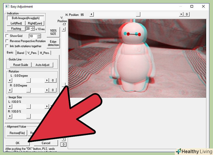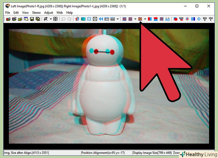Зробіть попередній перегляд анагліф.багатобарвна кнопка зліва від вертикальної червоно-блакитної кнопки покаже ваше фото як анагліф. Після того як ви їх зіставили, натисніть на неї і одягніть 3D окуляри. Щоб отримати краще уявлення, натисніть на символ, схожий на прямокутник з X на ньому. Це дасть вам повноекранне зображення. Після того, як ви досить на нього надивилися, щоб повернутися до звичайного екрану програми, натисніть клавішу Esc. Внесіть будь-які коригування у відповідність зображень, поки не будете задоволені результатом.