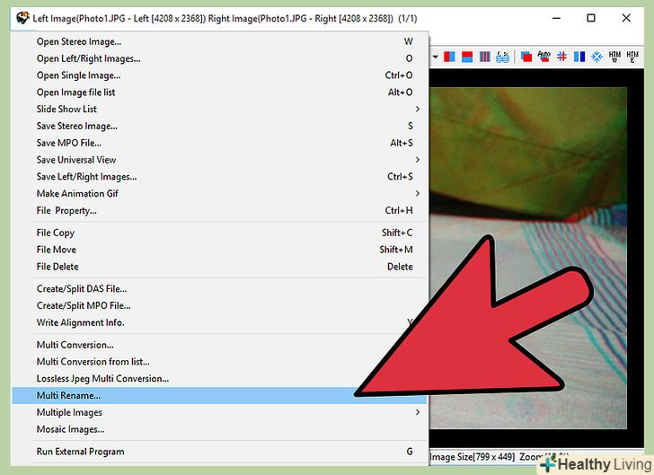 Мультіпереіменованіе розташоване в меню Файл (Файл gt; Мультіпереіменованіе). Ця функція дозволяє перейменовувати групи фотографій, змінюючи скриптові цифрові імена, дані камерами (наприклад, DSC000561) на більш корисні імена, такі як Імя001_l і Імя001_r. навіть якщо були прогалини в оригінальній числовій послідовності через видалень, дана функція послідовно перейменує їх, нумеруючи від 1 до загальної кількості у файлі. Це дуже корисно. Тепер буде набагато легше ідентифікувати два зображення, які формують стерео-пару, а якщо ви використовуєте мультиконверсійну функцію в StereoPhoto Maker, то автоматично перейменує незліченні стерео-пари.