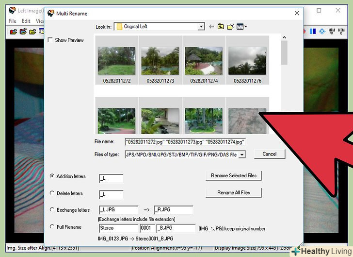 - Перейменуйте файли. Припустимо, ви почали з п'яти пар фотографій. Ви могли б назвати їх Фото1-Л, Фото1-П, Фото2-Л, Фото2-П, Фото3-Л, Фото3-П і так далі. Якщо у вас 10 або 20, або 50, або кілька сотень стерео-пар фотографій, перейменування їх по одній зайняло б багато часу. Є спосіб перейменувати всю папку, повну файлів (мульти-перейменування) в SPM, який описаний далі в цьому посібнику.
