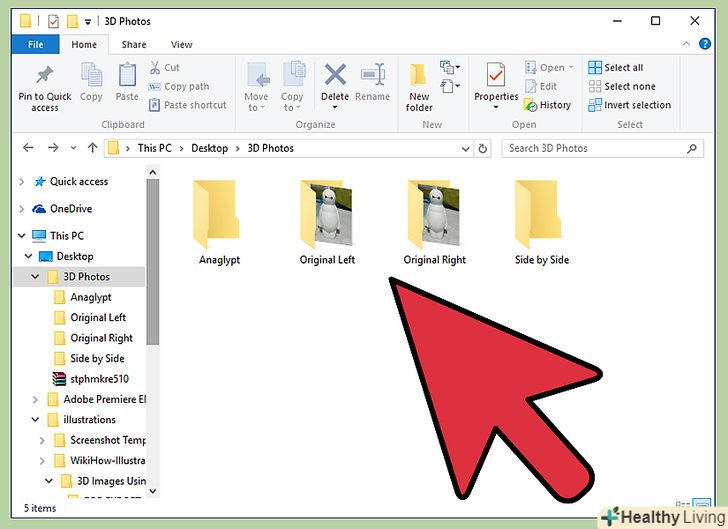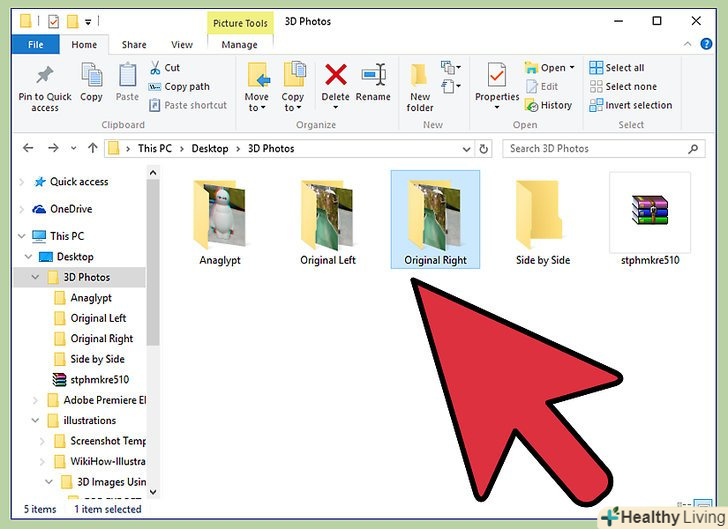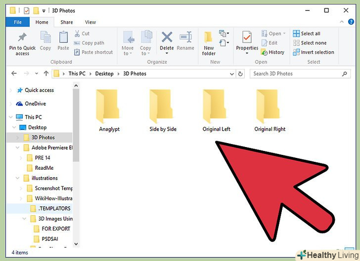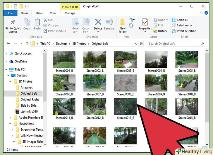 Перемістіть фотографії в свій комп'ютер.якщо ви використовуєте цифровий фотоапарат, корисно впорядкувати зображення для більш легкої обробки згодом. Створіть папку під назвою "3D фото". Всередині неї треба створити кілька папок. Одну можна назвати" оригінал правий "або" ОП", іншу - " оригінал лівий "або"ОЛ". Створіть ще одну папку під назвою "анагліф" і можливо ще одну "поруч". Це для зберігання вашої закінченої роботи.- Перемістіть зображення зі своєї камери в папку "3D фото", і потім розподіліть праві фотографії в папку" ОП "і ліві фотографії в папку"ОЛ". У кожній папці має бути рівна кількість фотографій.