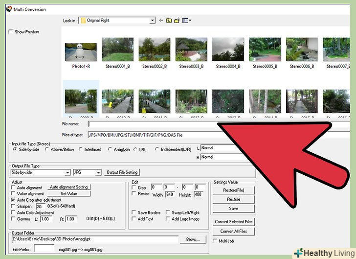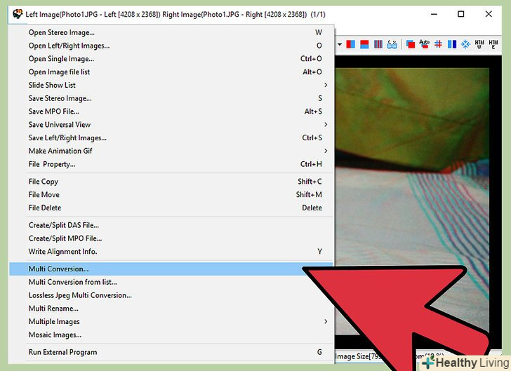 Виберіть Файл, Мультиперетворення.у Мультиперетворенні вкажіть програмі, з якими файлами ви хочете продовжити працювати, як ви хочете їх зберігати, і де зберігати. Для цього посібника ми припускаємо, що ви почнете з двох незалежних файлів фотографій. Оскільки ви стаєте більш просунутими в роботі з Stereophoto Maker, це може не завжди бути вірно, але в цілях цього керівництва будемо вважати так.