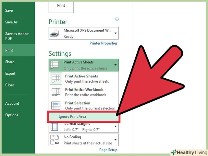 Змініть параметри друку.у випадаючому меню під меню зі списком встановлених принтерів виберіть опцію "надрукувати активні листи «і приберіть прапорець у»ігнорувати область друку".- Зверніть увагу, що, якщо вибрати опцію "надрукувати виділений фрагмент", будуть роздруковані виділені комірки, а не задана область друку.