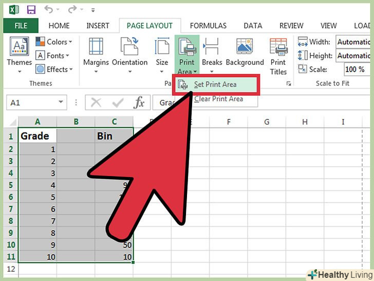 Перейдіть на вкладку "Розмітка сторінки". вона розташована у верхньому рядку меню (праворуч від вкладки "Файл" і двох інших вкладок). На цій вкладці можна змінити форматування таблиці. Серед опцій знайдіть опцію»Область друку".