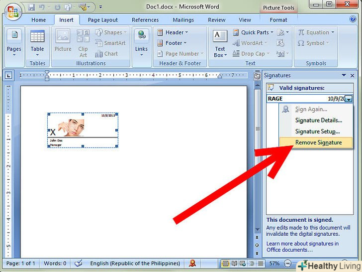 Delete (видаліть) або Remove (перемістіть) підпис, натиснувши на кнопку "Remove Signature."