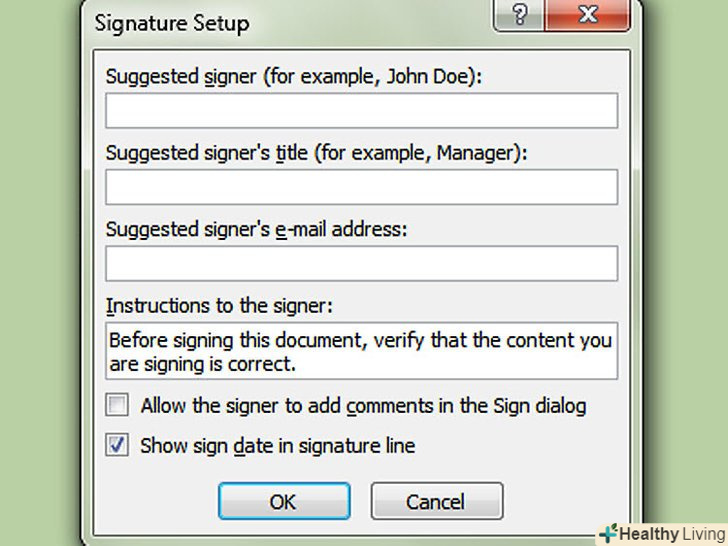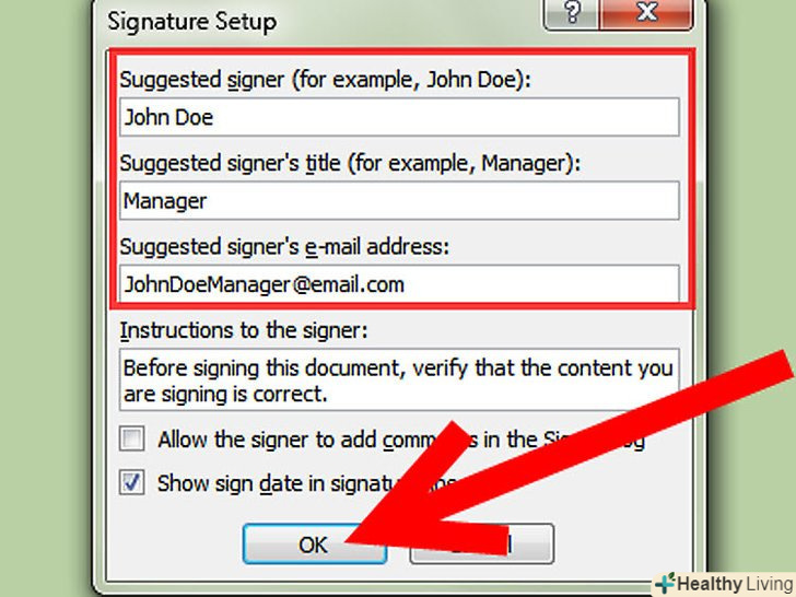 Заповніть текстові поля, такі як: "suggested signer", "suggested signer's title", "signer's email address" і т.д. натисніть "OK".