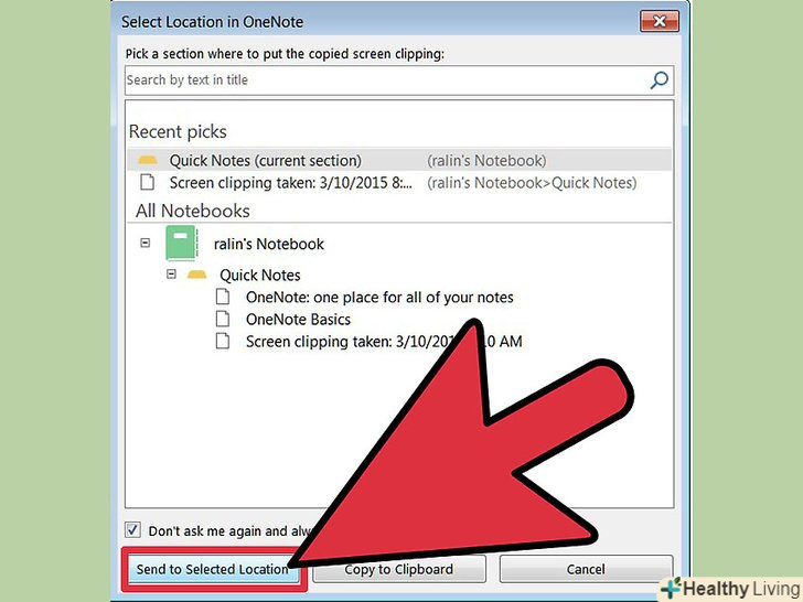 Після того, як скріншот зроблений, OneNote запитає про замітку для його збереження. створіть нову замітку, задайте її за замовчуванням і відзначте опцію, щоб програма не питала про це в подальшому.
