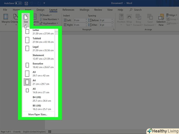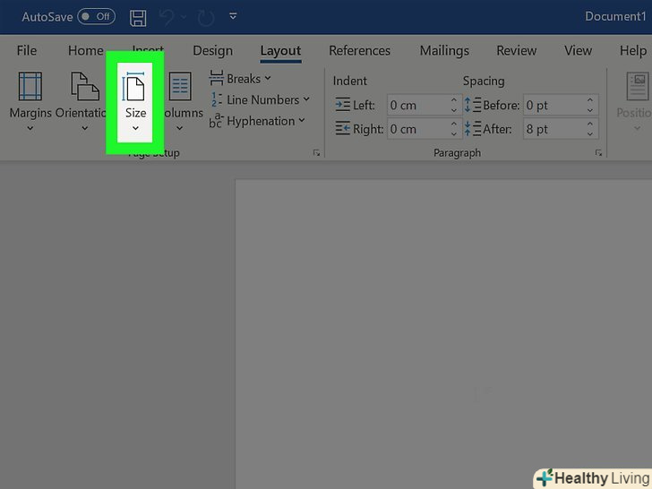 НатиснітьРозмір на панелі інструментів.ця опція знаходиться у верхньому лівому куті екрана. Відкриється список розмірів документа.