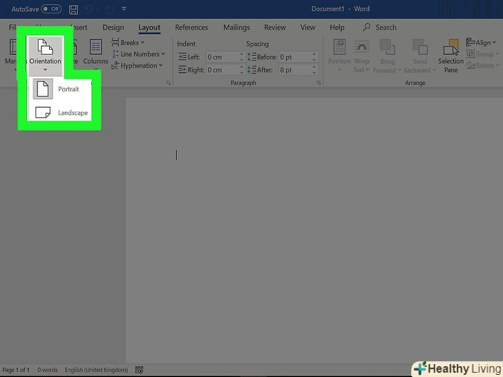 Виберіть орієнтацію плаката.щоб роздрукувати постер як сторінку альбому, клацніть по "орієнтація «на вкладці» Розмітка сторінки «і виберіть»Альбомна". Якщо ви не хочете змінювати книжкову орієнтацію (вона обрана за замовчуванням), пропустіть цей крок.