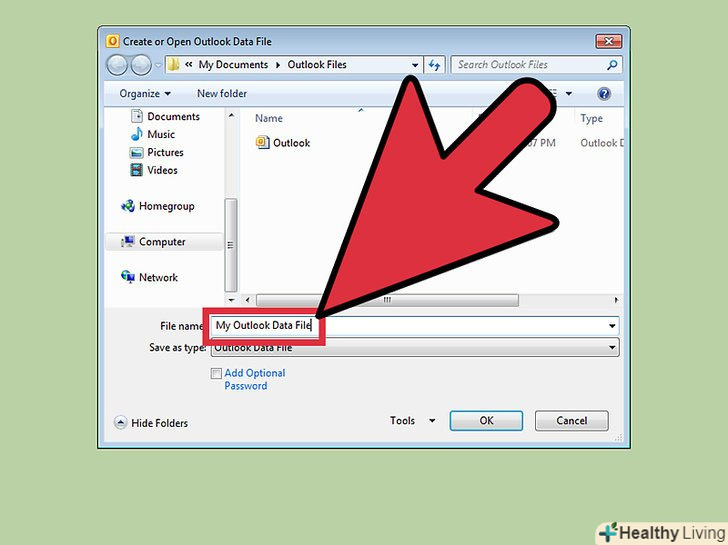 Введіть назву вашої нової папки.- Рекомендується називати PST файл так само, як плануєте назвати особисту папку в Outlook. Це допоможе і вам не заплутатися.