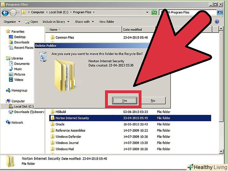 Видаліть будь-які залишилися папки.після перезавантаження комп'ютера, відкрийте папку Програми на диску C:. Знайдіть будь-які залишилися Папки Norton і видаліть їх. Можливо, ви побачите наступні папки:- Norton Internet Security