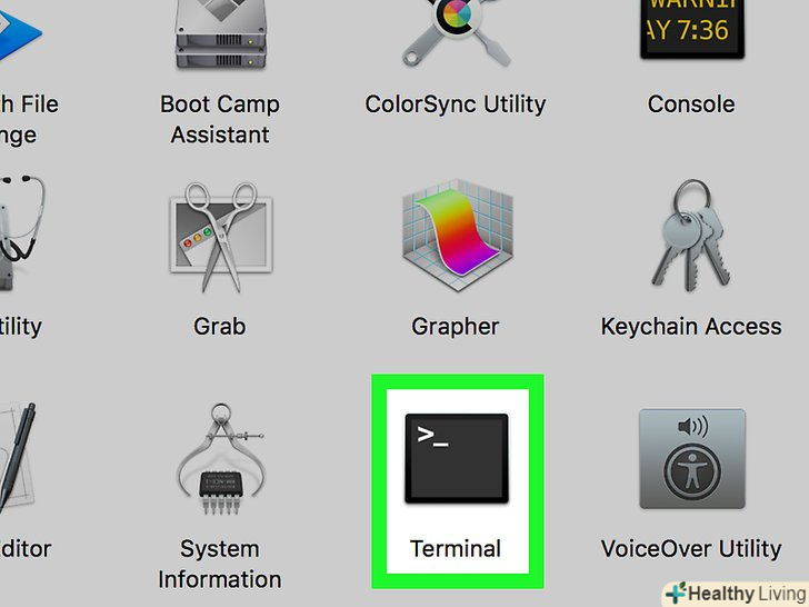 Двічі клацніть по «Термінал». Термінал позначений чорним, що нагадує екран значком з білими символами. Відкриється вікно терміналу.
