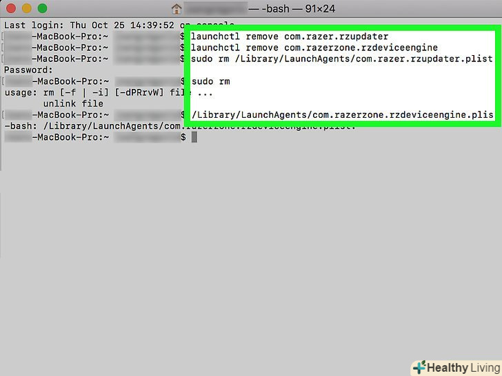 Введіть команди, щоб видалити папки та фали Razer. після введення кожної команди натискайте ⏎ return. Можливо, система попросить вас ввести пароль адміністратора.- Launchctl remove com.razer.rzupdater