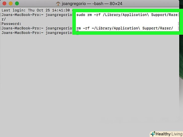 У терміналі введіть команди, щоб видалити папки з файлами, пов'язаними з Razer Synapse. [3]- Sudo rm -rf /Library/Application\ Support/Razer/