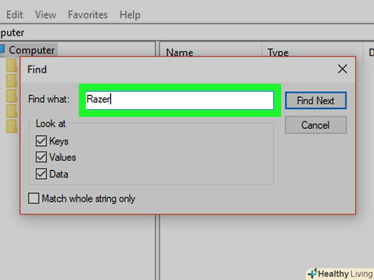 В рядку пошуку введітьRazer, а потім натисніть ↵ Enter. будуть знайдені всі елементи реєстру, пов'язані з Razer.