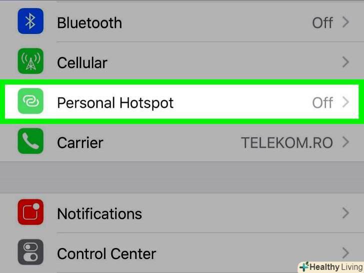 Натисніть "особиста точка доступу".якщо ваш провайдер мережі дозволяє цю функцію, то ви побачите іконку з особистою точкою доступу в першій групі налаштувань. Натисніть "особиста точка доступу".якщо ваш провайдер мережі дозволяє цю функцію, то ви побачите іконку з особистою точкою доступу в першій групі налаштувань.- На замітку: якщо ви не підключали цю можливість у вашого провайдера мережі, то ви повинні зробити це, перш ніж продовжувати роботу. Відвідайте сайт вашого провайдера і виберіть тариф, який найбільше підійде для використання даних.