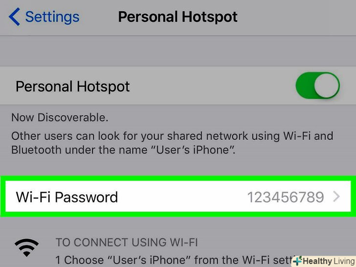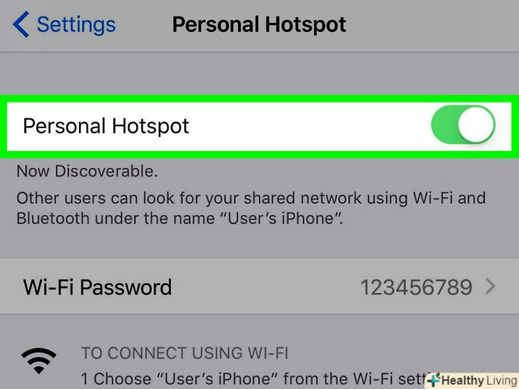 Підтвердіть підключення.як тільки ваш пристрій буде успішно підключено до точки доступу вашого iPhone, у верхньому лівому кутку екрану з'явиться символ двох зчеплених кілець - в тому місці, де зазвичай знаходиться іконка мережі WiFi. Підтвердіть підключення.як тільки ваш пристрій буде успішно підключено до точки доступу вашого iPhone, у верхньому лівому кутку екрану з'явиться символ двох зчеплених кілець - в тому місці, де зазвичай знаходиться іконка мережі WiFi.