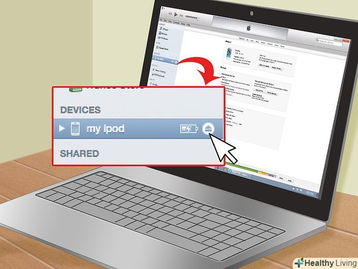 Вимкніть iPod.коли Синхронізація завершиться, клацніть по iPod на лівій бічній панелі. Натисніть кнопку "Витягти", яка відобразиться у значка iPod, щоб безпечно витягти пристрій. Тепер вимкніть iPod від комп'ютера. Вимкніть iPod.коли Синхронізація завершиться, клацніть по iPod на лівій бічній панелі. Натисніть кнопку "Витягти", яка відобразиться у значка iPod, щоб безпечно витягти пристрій. Тепер вимкніть iPod від комп'ютера.