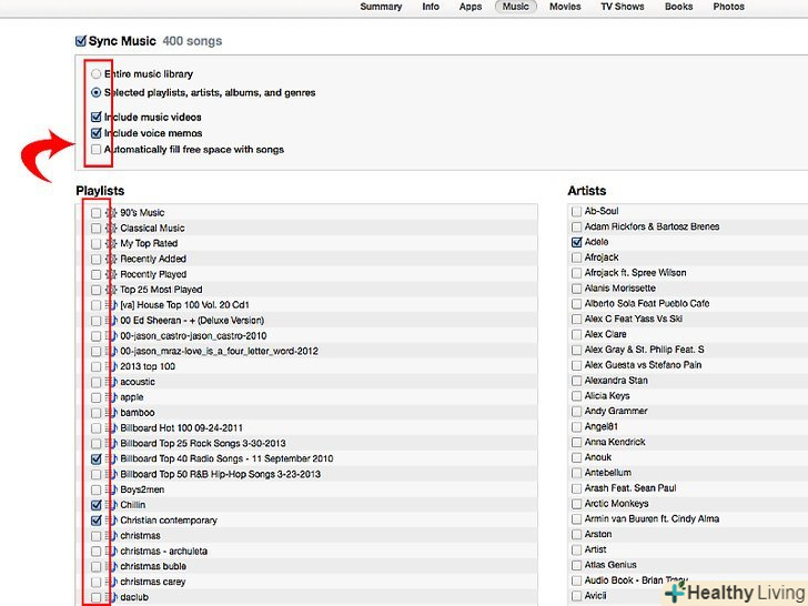 Виберіть вміст для синхронізації.за замовчуванням буде синхронізована вся музика, яка знаходиться в медіатеці iTunes. Виберіть iPod на лівій бічній панелі, а потім клацніть по вкладці "Музика" вгорі вікна. Встановіть прапорець біля "синхронізувати музику«, а потім натисніть»вибрані плейлисти, виконавці, альбоми та жанри". Виберіть вміст для синхронізації.за замовчуванням буде синхронізована вся музика, яка знаходиться в медіатеці iTunes. Виберіть iPod на лівій бічній панелі, а потім клацніть по вкладці "Музика" вгорі вікна. Встановіть прапорець біля "синхронізувати музику«, а потім натисніть»вибрані плейлисти, виконавці, альбоми та жанри".- Виберіть плейлисти, виконавців, альбоми та жанри, які будуть синхронізовані з iPod.
