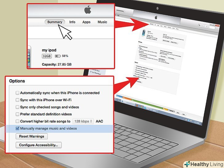 Підключіть iPod до комп'ютера.для цього скористайтеся USB-кабелем, який поставляється разом з iPod. Значок iPod відобразиться на лівій бічній панелі в розділі "Пристрої". Клацніть по цьому значку, щоб вибрати його. Підключіть iPod до комп'ютера.для цього скористайтеся USB-кабелем, який поставляється разом з iPod. Значок iPod відобразиться на лівій бічній панелі в розділі "Пристрої". Клацніть по цьому значку, щоб вибрати його.