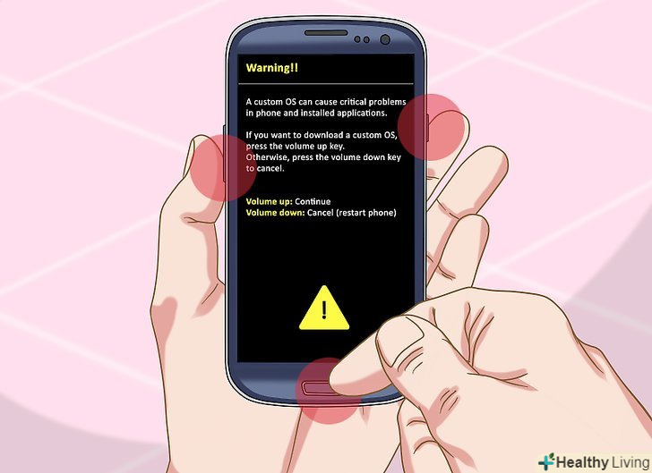Затисніть кнопки "Додому", зменшення гучності і харчування.спочатку затисніть кнопку "Додому", а потім кнопку зменшення гучності. Утримуючи обидві кнопки натиснутими, затисніть кнопку живлення. Ви зрозумієте, що все зробили правильно, коли на екрані з'явиться попередження з жовтим знаком «!».[3] Затисніть кнопки "Додому", зменшення гучності і харчування.спочатку затисніть кнопку "Додому", а потім кнопку зменшення гучності. Утримуючи обидві кнопки натиснутими, затисніть кнопку живлення. Ви зрозумієте, що все зробили правильно, коли на екрані з'явиться попередження з жовтим знаком «!».[3]