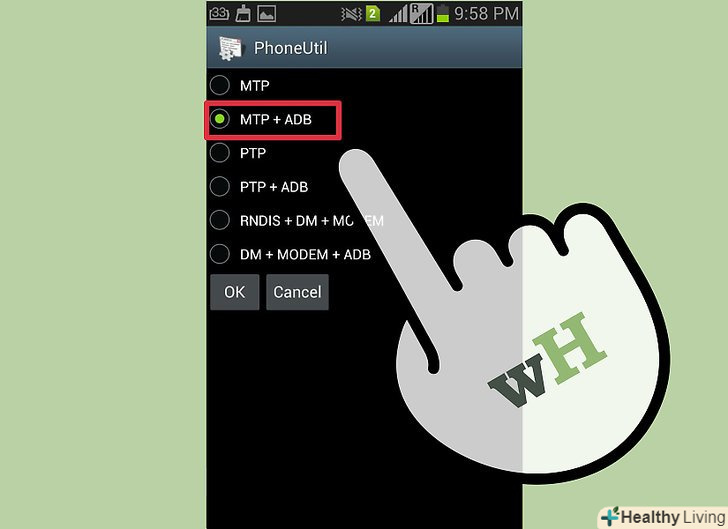 Виберіть "MTP + ADB" і торкніться OK, щоб примусово запустити MTP-режим на телефоні. Виберіть "MTP + ADB" і торкніться OK, щоб примусово запустити MTP-режим на телефоні.