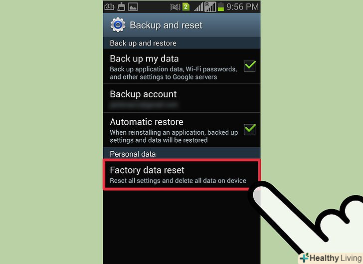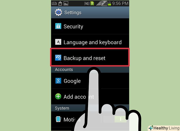 Перейдіть на вкладку "Облікові записи «і виберіть»Резервне копіювання і скидання".так ви потрапите в меню скидання пристрою до заводських налаштувань. Перейдіть на вкладку "Облікові записи «і виберіть»Резервне копіювання і скидання".так ви потрапите в меню скидання пристрою до заводських налаштувань.