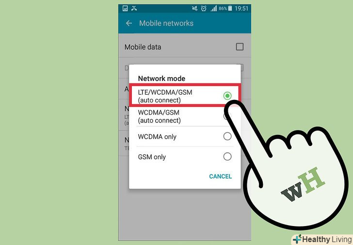 Виберіть " LTE / CDMA,""LTE / CDMA / EVDO" або " LTE auto." Будь-яка з цих опцій дозволить вам підключитися до мережі LTE вашого оператора.[2] Виберіть " LTE / CDMA,""LTE / CDMA / EVDO" або " LTE auto." Будь-яка з цих опцій дозволить вам підключитися до мережі LTE вашого оператора.[2]- Якщо ви не бачите жоден з цих пунктів (відображаються тільки пов'язані з GSM), в такому випадку ваш S3 не має можливості підключення до мереж 4G.