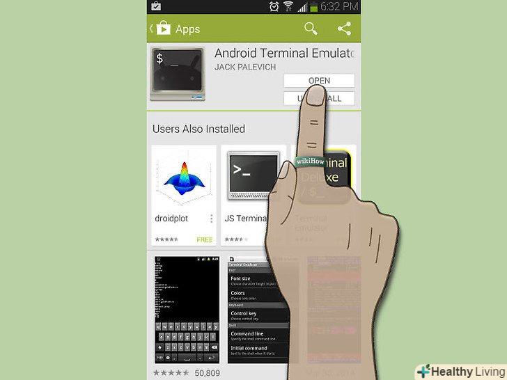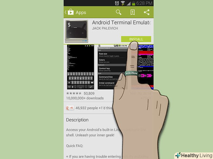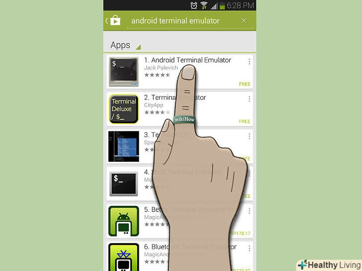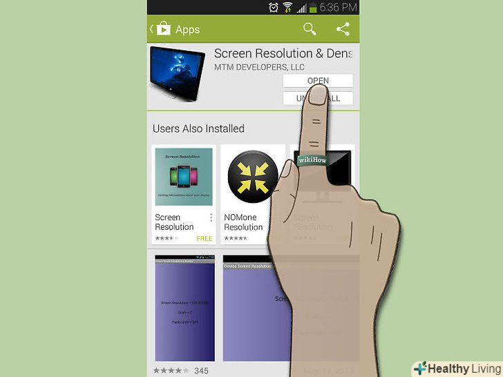 Знайдіть програми "Android Terminal Emulator "і"Screen Resolution and Density". натисніть на перші програми в результатах пошуку. Їх авторами будуть Jack Palevich і MTM Developers відповідно. Знайдіть програми "Android Terminal Emulator "і"Screen Resolution and Density". натисніть на перші програми в результатах пошуку. Їх авторами будуть Jack Palevich і MTM Developers відповідно.