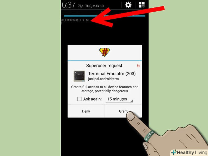 Запустіть Terminal Emulator.відкрийте програму Android Terminal Emulator. Це консоль, що нагадує консоль Windows DOS, через яку запускаються вводяться користувачем команди. Запустіть Terminal Emulator.відкрийте програму Android Terminal Emulator. Це консоль, що нагадує консоль Windows DOS, через яку запускаються вводяться користувачем команди.