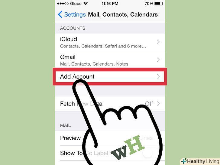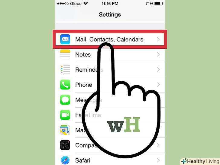 Прокрутіть сторінку вниз і клацніть по " Mail, Contacts, Calendars»(пошта, контакти, календар). Прокрутіть сторінку вниз і клацніть по " Mail, Contacts, Calendars»(пошта, контакти, календар).