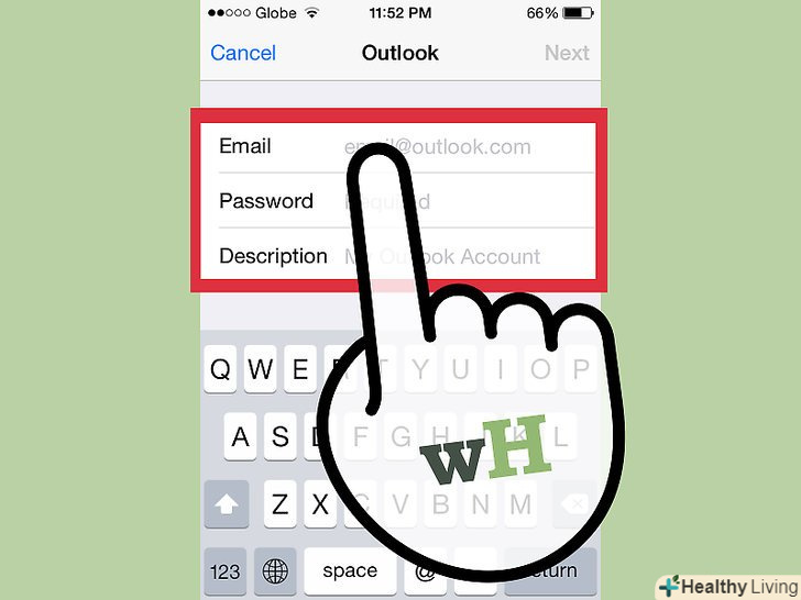 Введіть адресу електронної пошти та пароль у відповідні поля та додайте опис облікового запису, наприклад, "Hotmail". Введіть адресу електронної пошти та пароль у відповідні поля та додайте опис облікового запису, наприклад, "Hotmail".