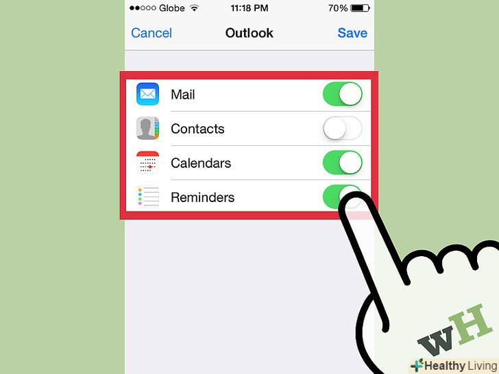 Вирішіть, чи хочете ви використовувати "Contacts"(контакти), "Calendars «(календар) або»Reminders «(нагадування) з цим обліковим записом; Якщо так, то встановіть перемикачі поруч з кожною опцією в позицію»On". Вирішіть, чи хочете ви використовувати "Contacts"(контакти), "Calendars «(календар) або»Reminders «(нагадування) з цим обліковим записом; Якщо так, то встановіть перемикачі поруч з кожною опцією в позицію»On".