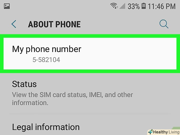Знайдіть свій номер телефону. він вказаний вгорі сторінки в рядку "Номер телефону". Якщо відображається невірний номер телефону або ви бачите слово «невідомий», додайте номер через додаток «Контакти». Якщо у вас старий смартфон і ваш номер телефону взагалі не відображається, виконайте наступні дії: Знайдіть свій номер телефону. він вказаний вгорі сторінки в рядку "Номер телефону". Якщо відображається невірний номер телефону або ви бачите слово «невідомий», додайте номер через додаток «Контакти». Якщо у вас старий смартфон і ваш номер телефону взагалі не відображається, виконайте наступні дії:- Натисніть "Статус" на сторінці "Про телефон".