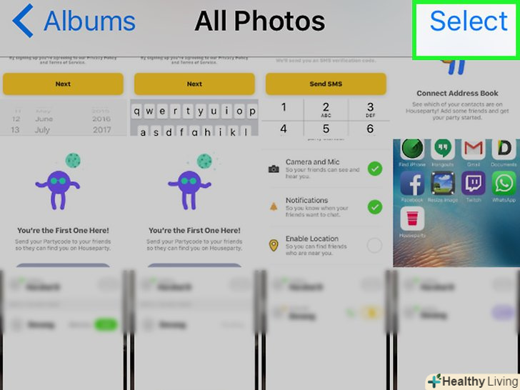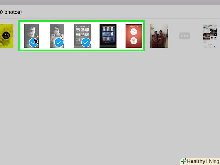 Виберіть фотографії.натисніть на кожну фотографію, яку ви хочете перенести на комп'ютер. У кутку кожної вибраної фотографії з'явиться синьо-білий значок. Виберіть фотографії.натисніть на кожну фотографію, яку ви хочете перенести на комп'ютер. У кутку кожної вибраної фотографії з'явиться синьо-білий значок.