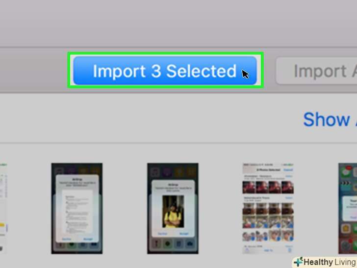 НатиснітьІмпортувати вибрані.ця опція знаходиться у верхньому правому куті екрана. На цій сірій кнопці також відобразиться кількість виділених зображень (наприклад, «імпортувати 34 вибрані»). НатиснітьІмпортувати вибрані.ця опція знаходиться у верхньому правому куті екрана. На цій сірій кнопці також відобразиться кількість виділених зображень (наприклад, «імпортувати 34 вибрані»).- Щоб скопіювати всі нові фотографії, натисніть "імпортувати всі нові фото".