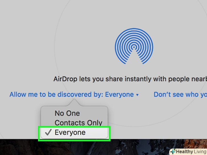 Активуйте AirDrop на комп'ютері Mac.для цього відкрийте Finder, натисніть "AirDrop «(в лівій частині вікна Finder), клацніть по посиланню» дозволити моє виявлення «і в випадаючому меню виберіть»всім". Активуйте AirDrop на комп'ютері Mac.для цього відкрийте Finder, натисніть "AirDrop «(в лівій частині вікна Finder), клацніть по посиланню» дозволити моє виявлення «і в випадаючому меню виберіть»всім".- Якщо посередині вікна AirDrop з'явилася кнопка "включити Bluetooth", клацніть по ній, щоб активувати Bluetooth на комп'ютері.