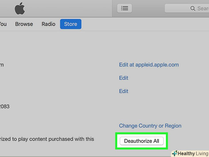 Клацніть поДеавторизовать. ви знайдете цю опцію в правому нижньому кутку. Apple ID буде деавторизований в iTunes, Музика, Apple TV і Apple Books на комп'ютері Mac. Клацніть поДеавторизовать. ви знайдете цю опцію в правому нижньому кутку. Apple ID буде деавторизований в iTunes, Музика, Apple TV і Apple Books на комп'ютері Mac.