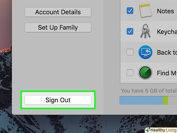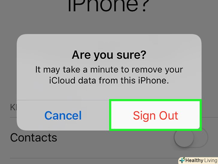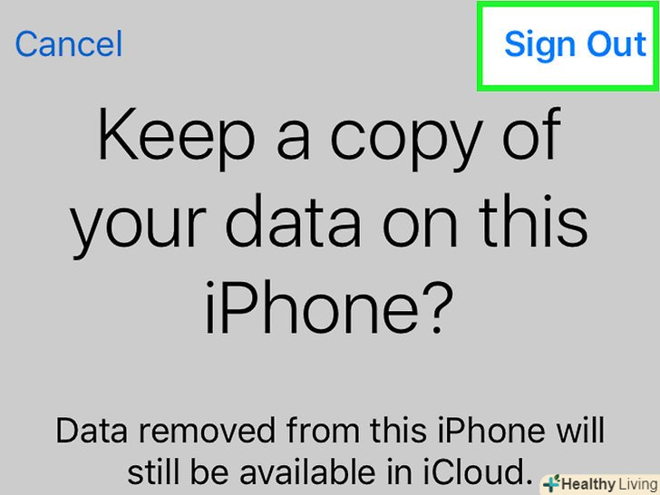 Клацніть поВийти. ця опція знаходиться в лівому нижньому кутку. Клацніть поВийти. ця опція знаходиться в лівому нижньому кутку.- Можливо, Вам буде запропоновано зберегти копію даних, що зберігаються у вашому обліковому записі iCloud. В цьому випадку встановіть прапорець біля відповідних типів даних і клацніть по»зберегти копію".