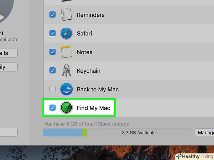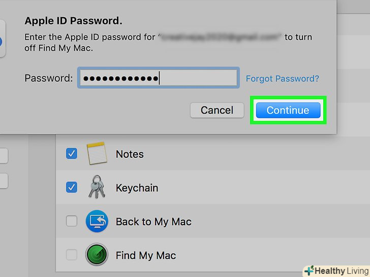 Прокрутіть сторінку вниз і зніміть прапорець біля «знайти Mac».вказана опція розташована внизу вікна.[3] Прокрутіть сторінку вниз і зніміть прапорець біля «знайти Mac».вказана опція розташована внизу вікна.[3]