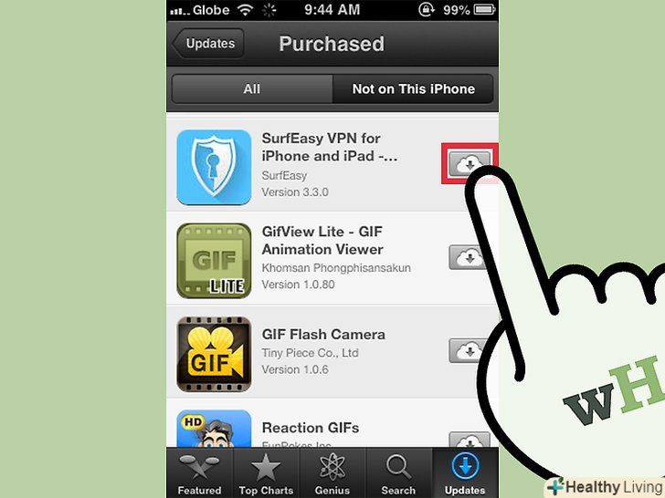 Натисніть на значок Хмари поруч з додатком, яке ви бажаєте завантажити на пристрій.- Перед початком завантаження вам може бути запропоновано ввести ваш ідентифікатор Apple ID.