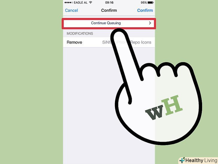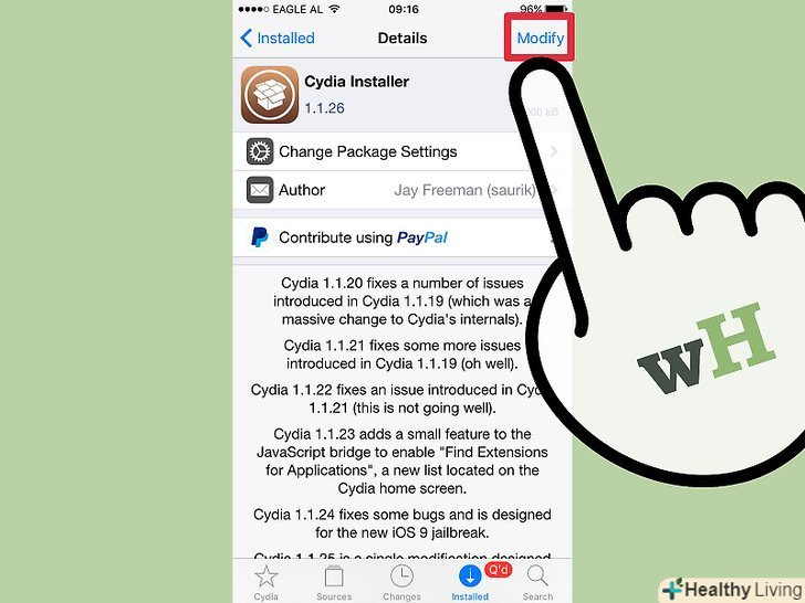 Видаліть пакет " установник Cydia "(»Cydia Installer").відкрийте сторінку з докладною інформацією для пакета "установник Cydia «і натисніть» Змінити «(»Modify"). Виберіть пункт " Видалити» («Remove»), а потім«підтвердити»("Confirm"). Додаток Cydia буде видалено. Після видалення ваш мобільний пристрій буде автоматично перезавантажено.[2]